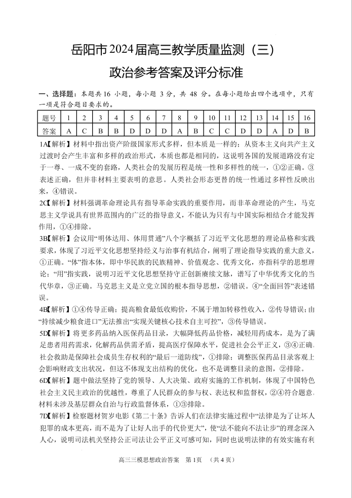湖南省岳阳市2024届高三教学质量监测(三)(岳阳三模)政治答案