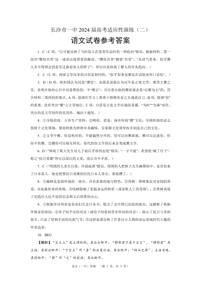 湖南省长沙市第一中学2024届高考适应性演练(二)语文答案