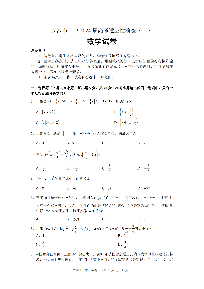湖南省长沙市第一中学2024届高考适应性演练(二)数学