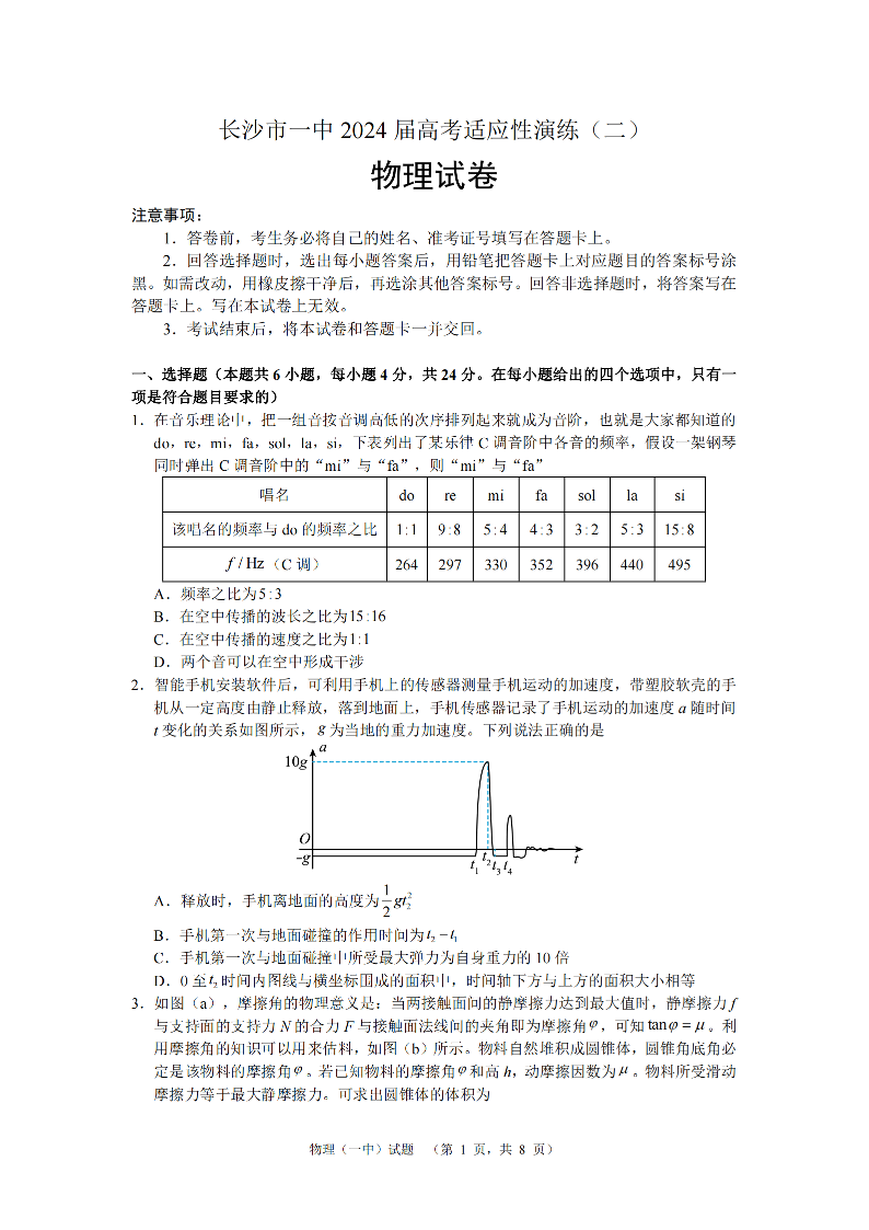 湖南省长沙市第一中学2024届高考适应性演练(二)物理