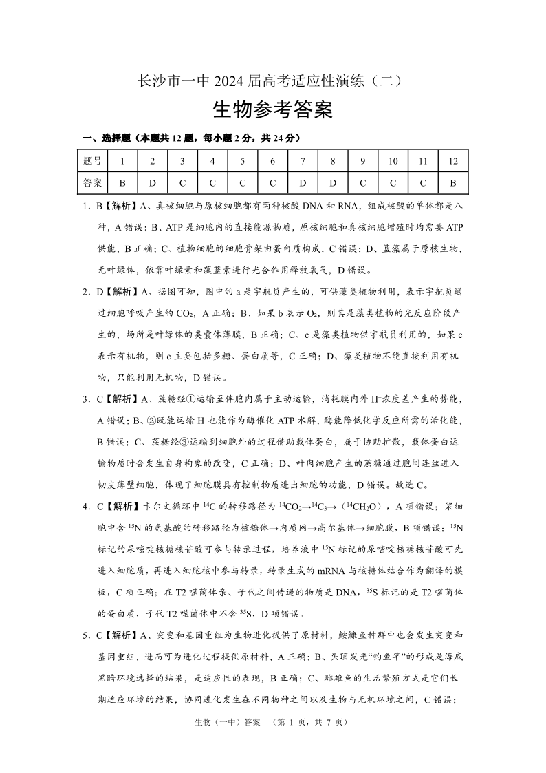 湖南省长沙市第一中学2024届高考适应性演练(二)生物答案