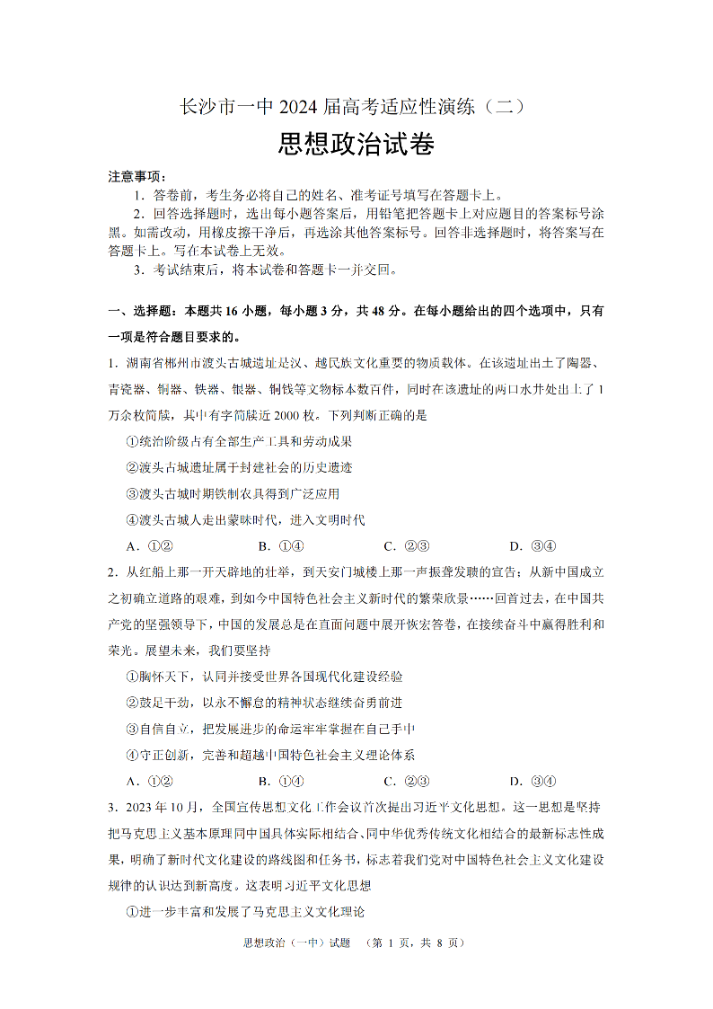 湖南省长沙市第一中学2024届高考适应性演练(二)政治