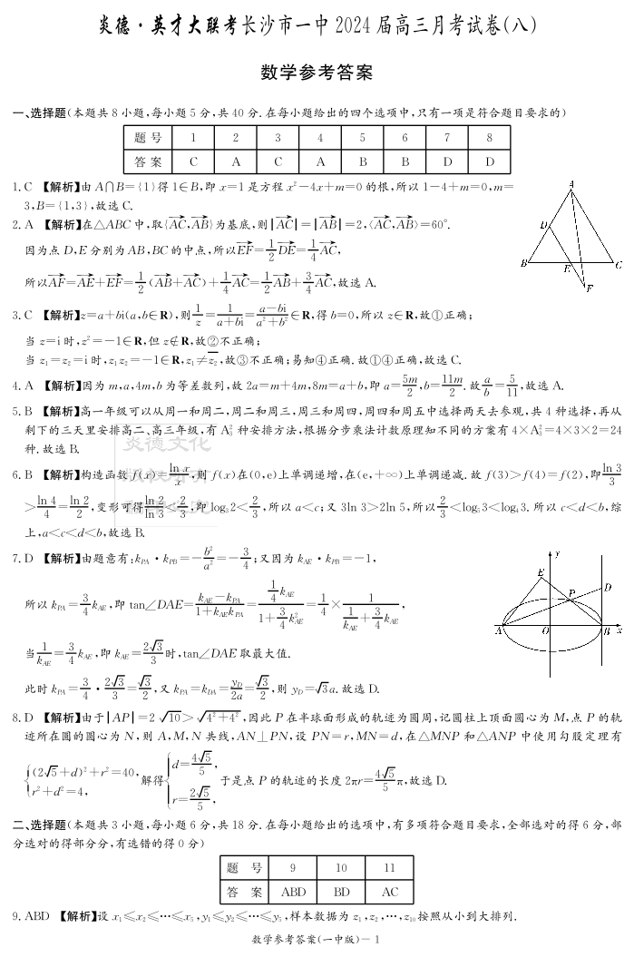 湖南省长沙市第一中学2024届高三下学期月考(八)数学答案