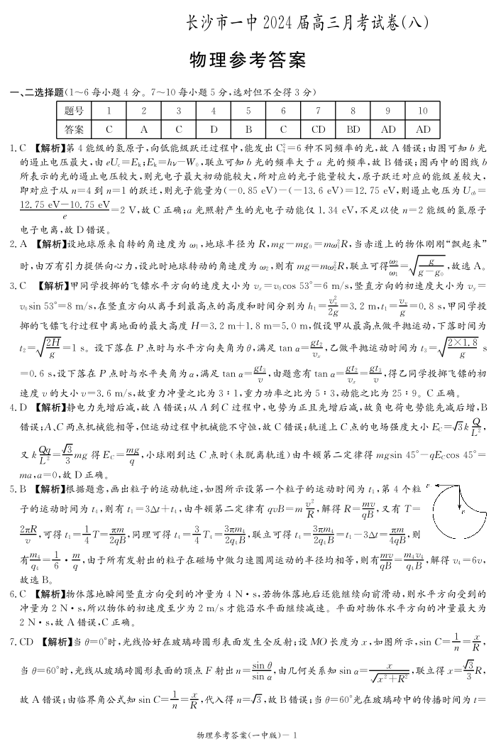 湖南省长沙市第一中学2024届高三下学期月考(八)物理答案