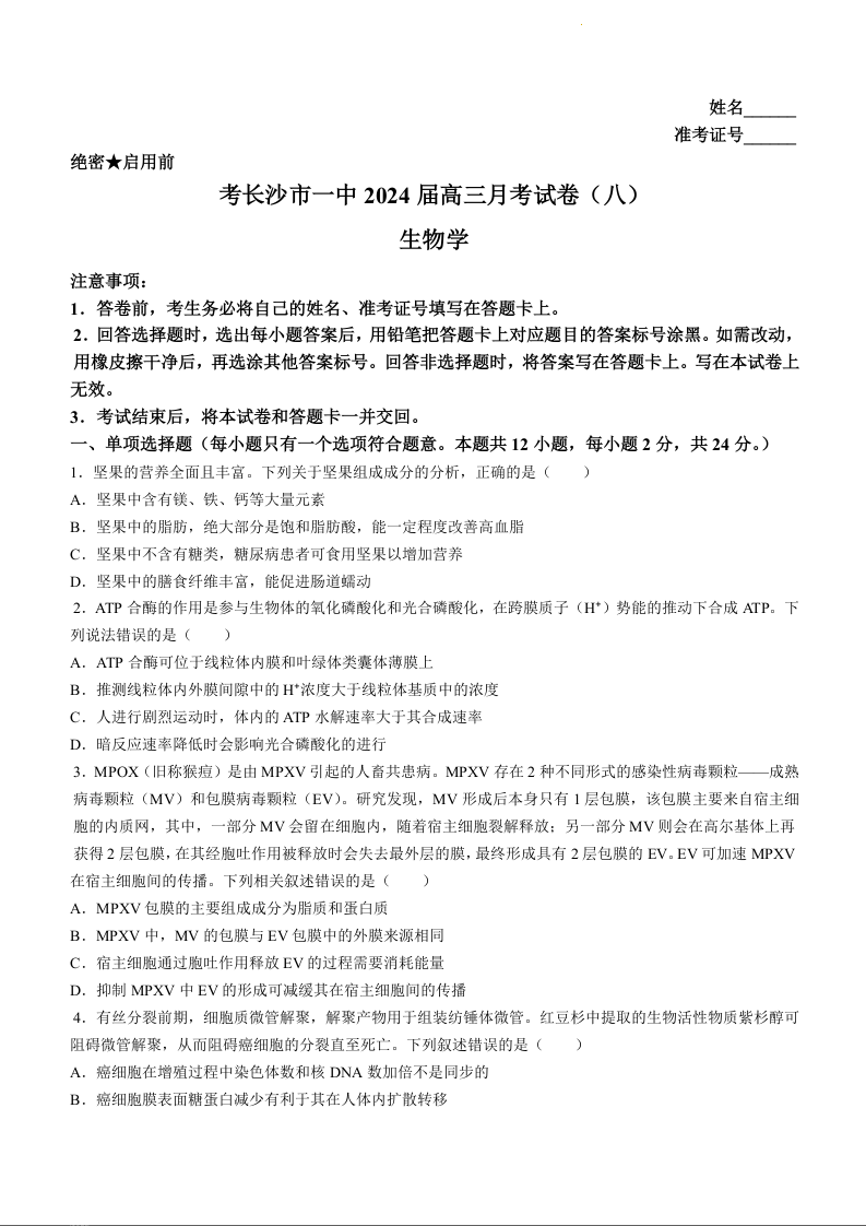 湖南省长沙市第一中学2024届高三下学期月考(八)生物+答案