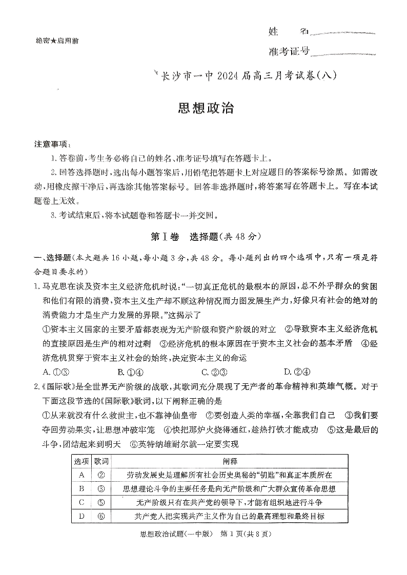 湖南省长沙市第一中学2024届高三下学期月考(八)政治