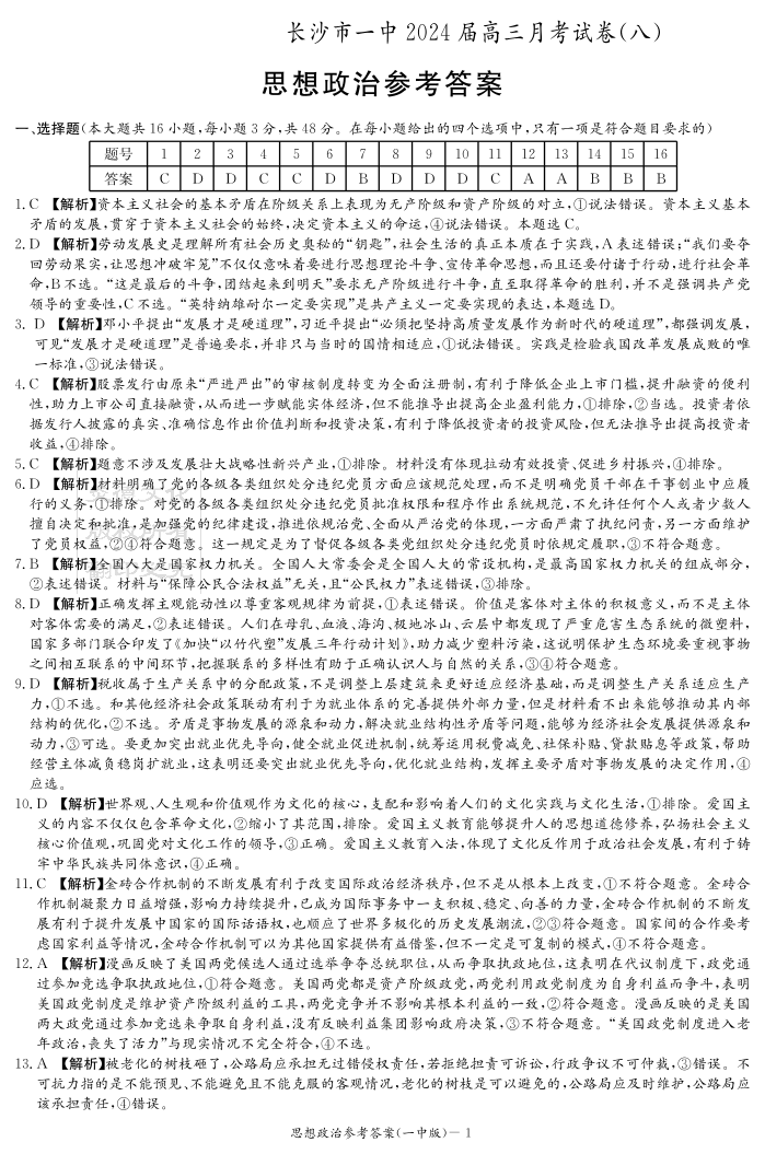 湖南省长沙市第一中学2024届高三下学期月考(八)政治答案