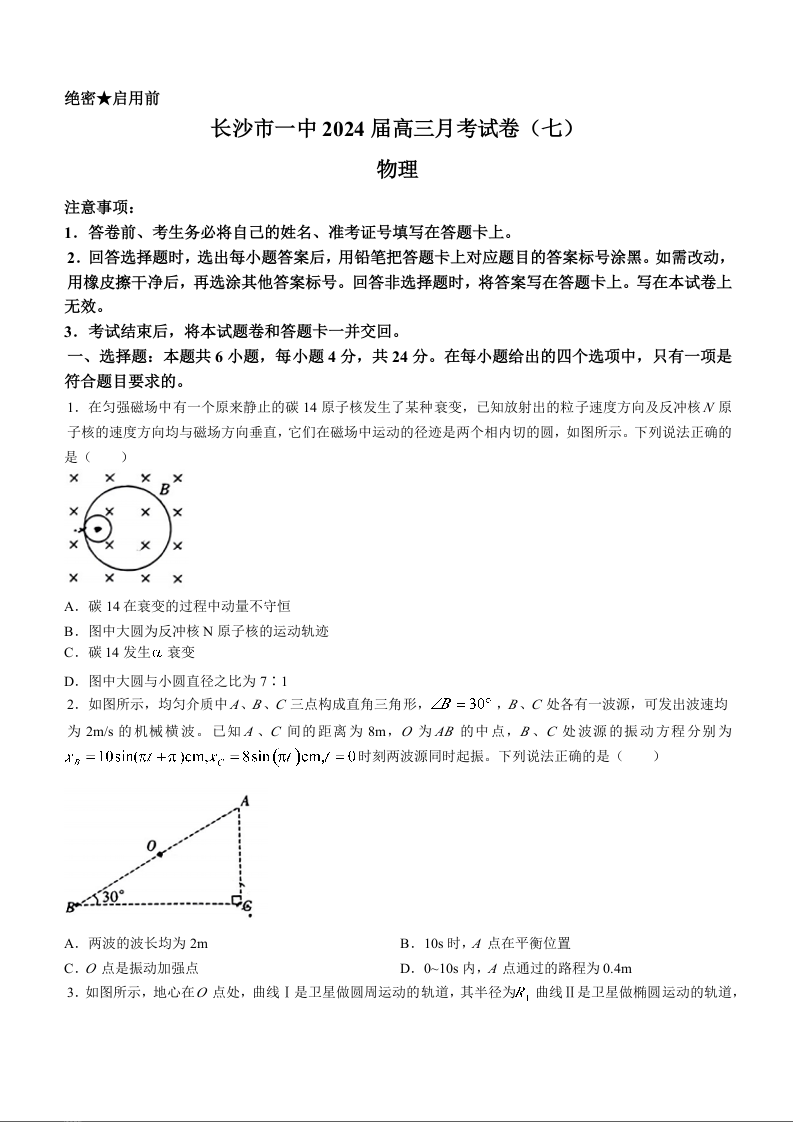 湖南省长沙市第一中学2024届高三下学期月考(七)物理