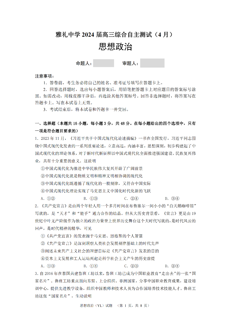 湖南省长沙市雅礼中学2024届高三4月综合测试政治+答案