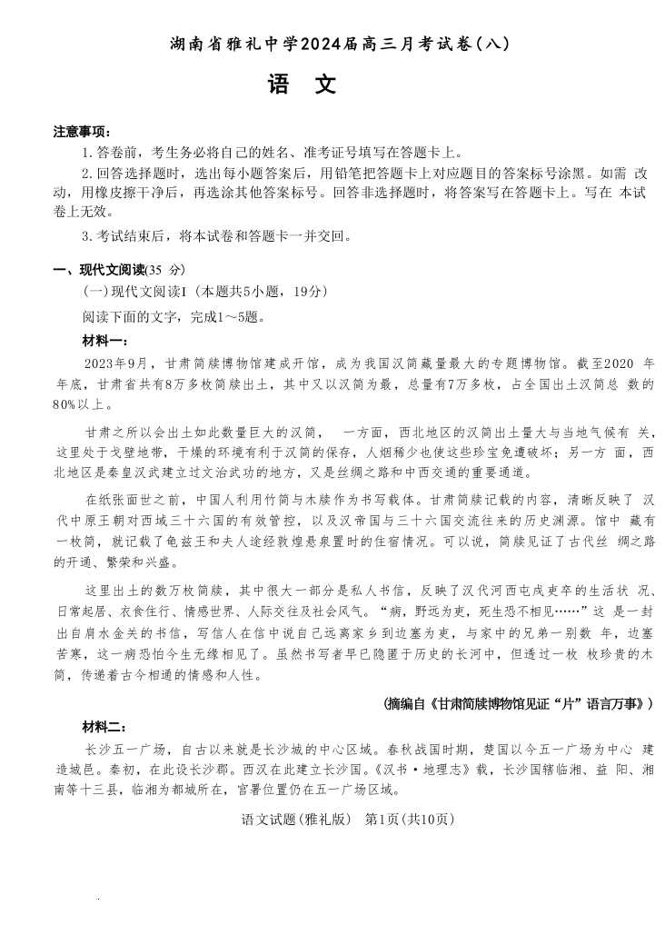 湖南省长沙市雅礼中学2024届高三下学期月考(八)语文+答案