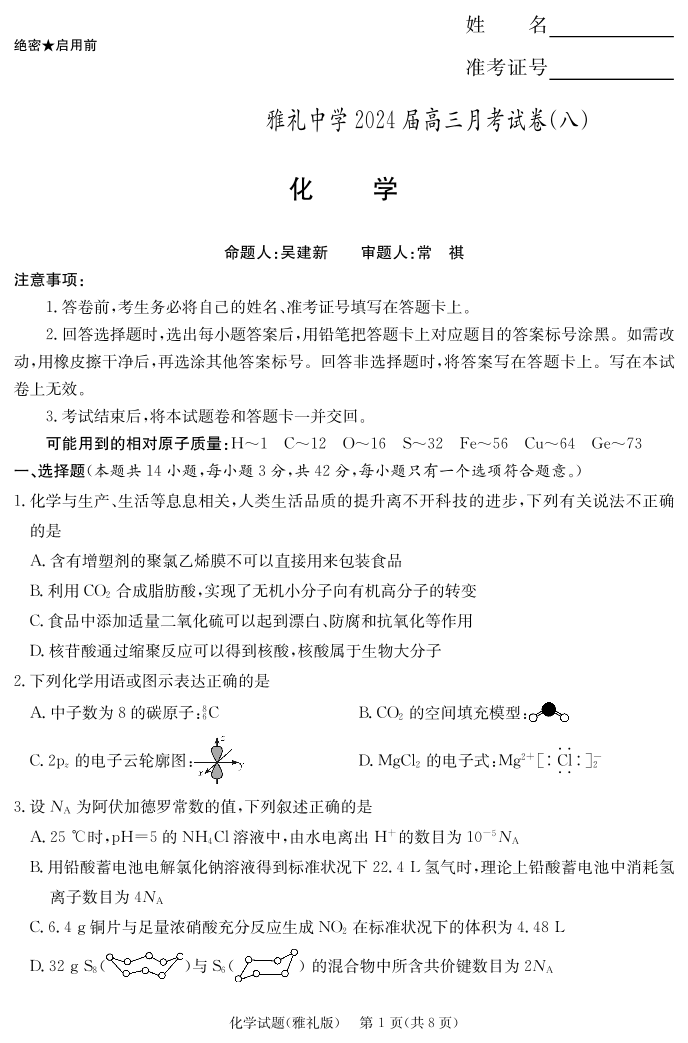 湖南省长沙市雅礼中学2024届高三下学期月考(八)化学