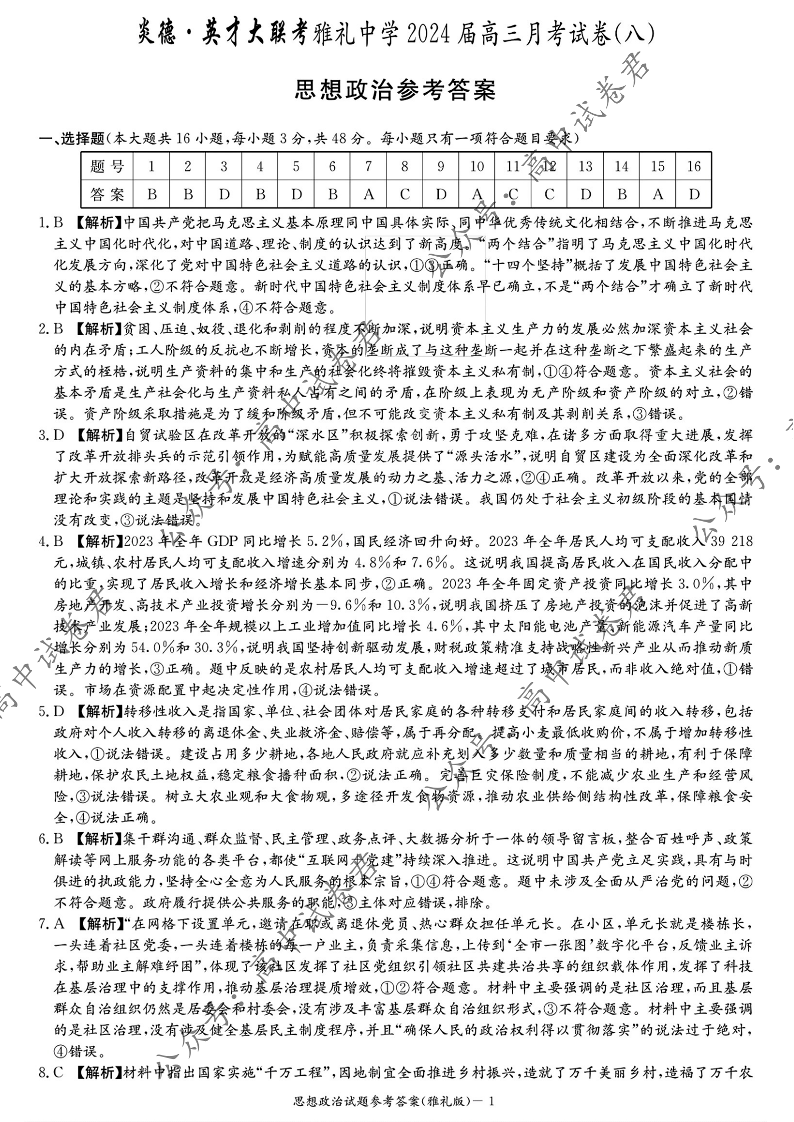 湖南省长沙市雅礼中学2024届高三下学期月考(八)政治答案