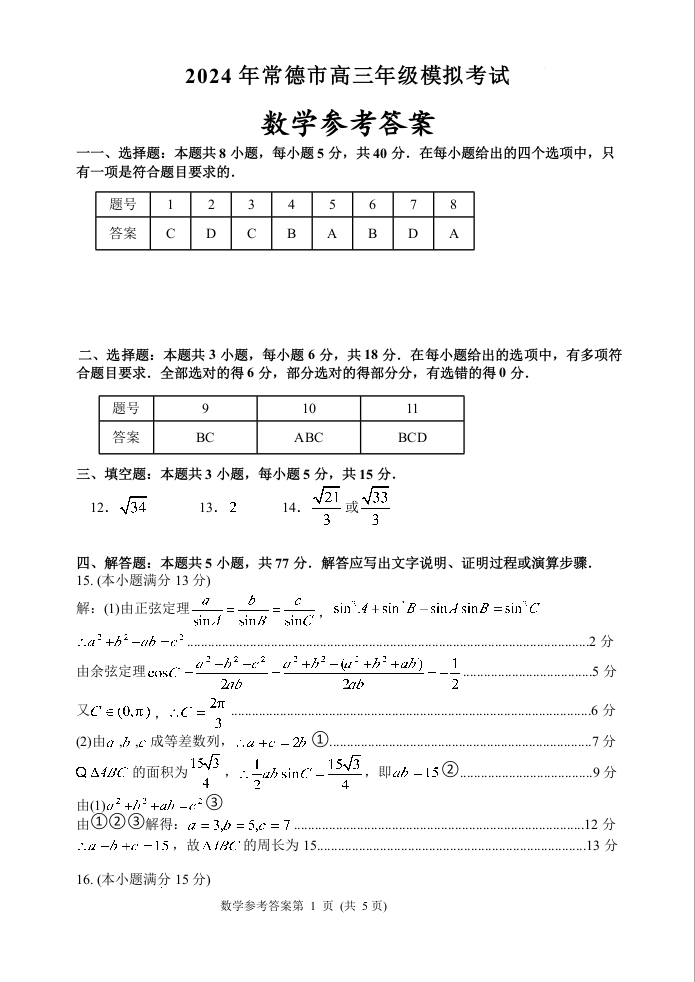 湖南省常德市2024届高三下学期3月模拟考试数学答案