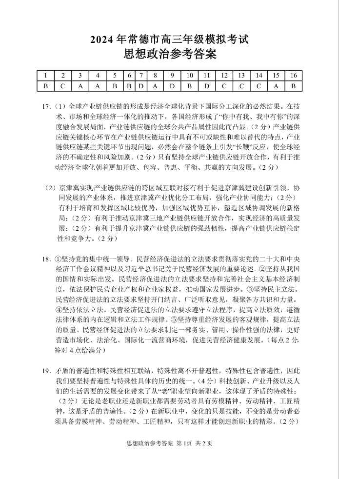 湖南省常德市2024届高三下学期3月模拟考试政治答案