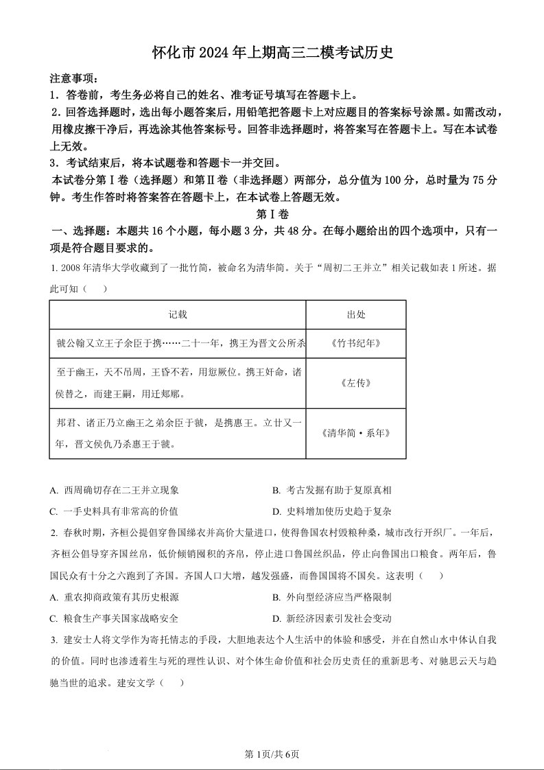 湖南省怀化市2024届高三下学期第二次模拟考试(怀化二模)历史 (原卷版)