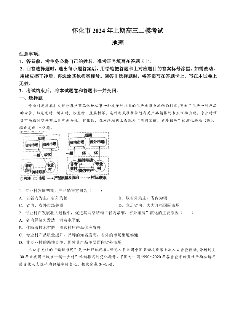 湖南省怀化市2024届高三下学期第二次模拟考试(怀化二模)地理+答案