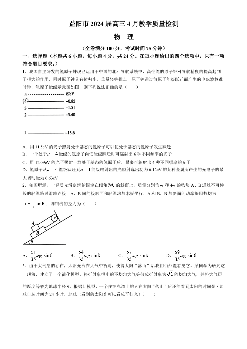 湖南省益阳市2024届高三下学期4月联考(三模)物理