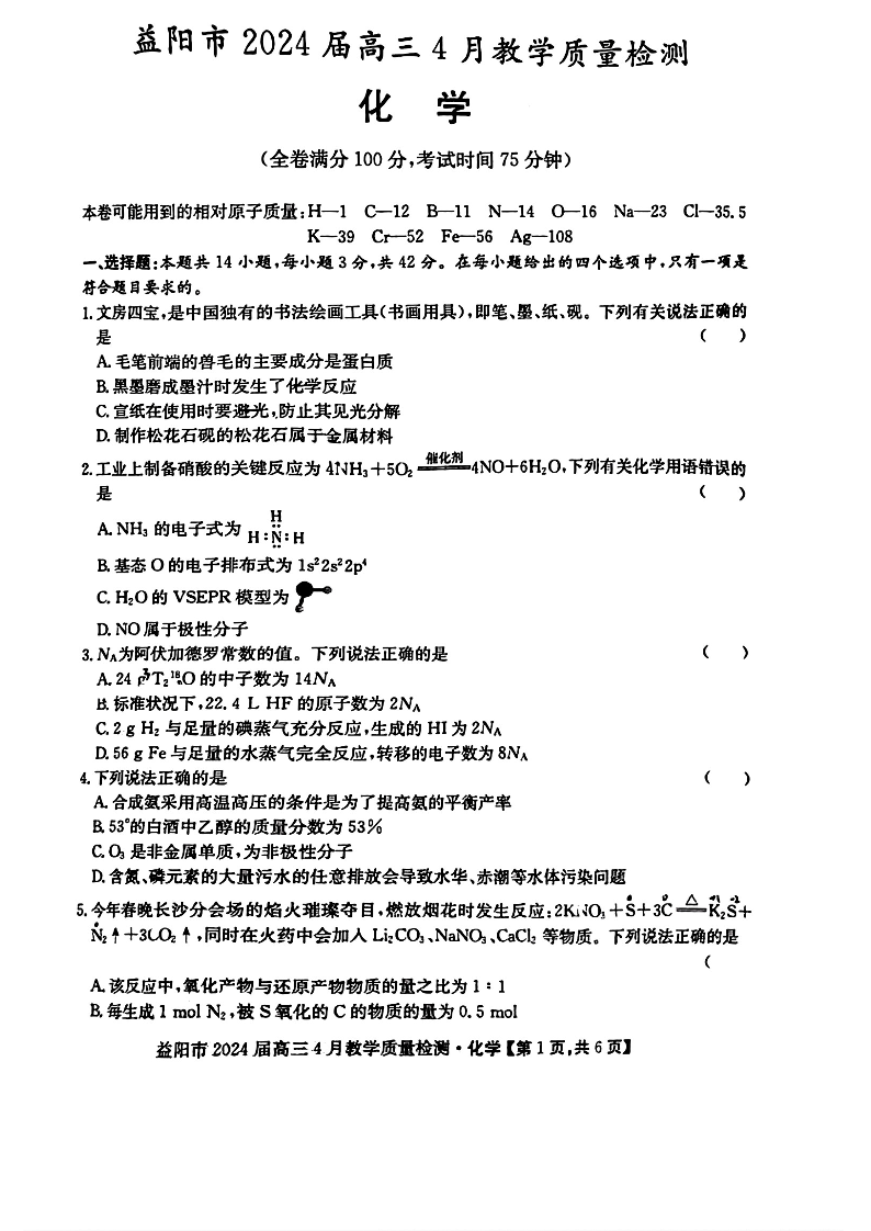 湖南省益阳市2024届高三下学期4月联考(三模)化学