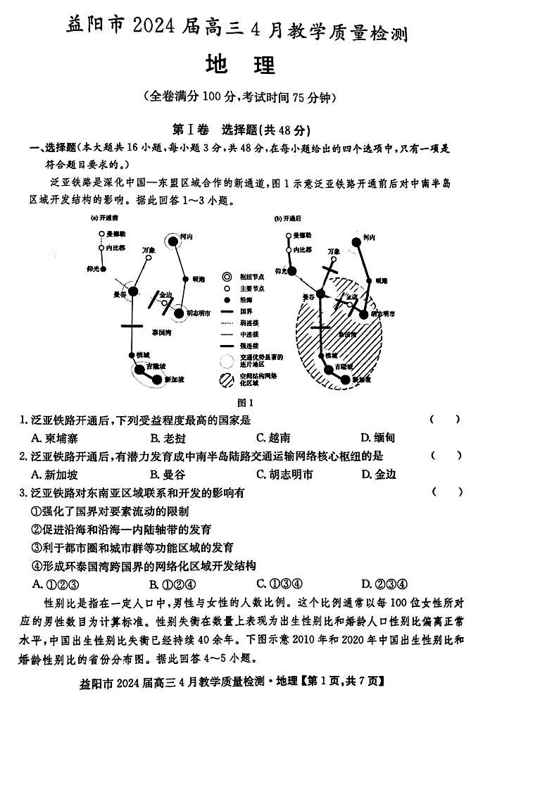 湖南省益阳市2024届高三下学期4月联考(三模)地理