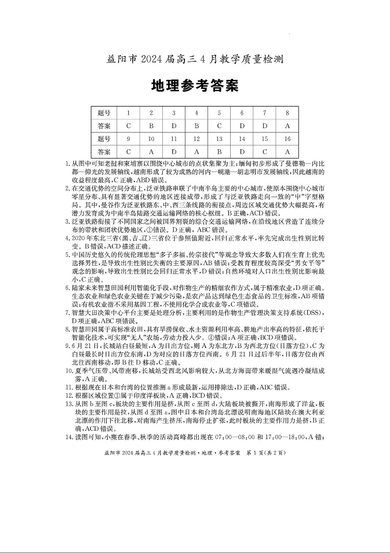 湖南省益阳市2024届高三下学期4月联考(三模)地理答案