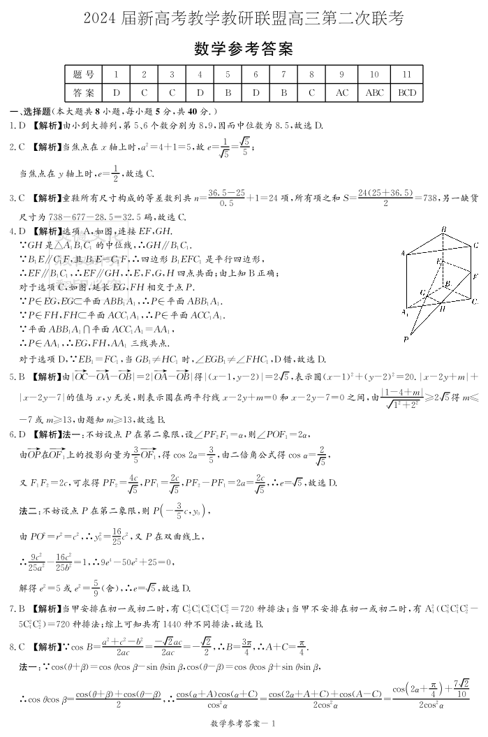 湖南新高考教学教研联盟2024届(暨长郡十八校)高三第二次联考数学答案