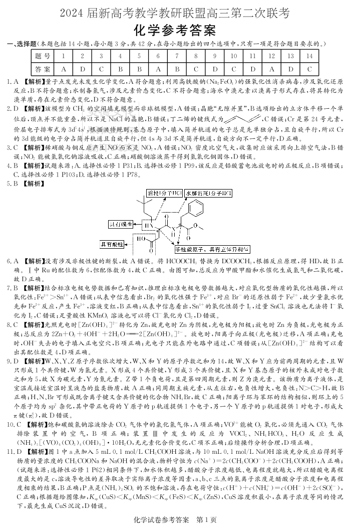 湖南新高考教学教研联盟2024届(暨长郡十八校)高三第二次联考化学答案
