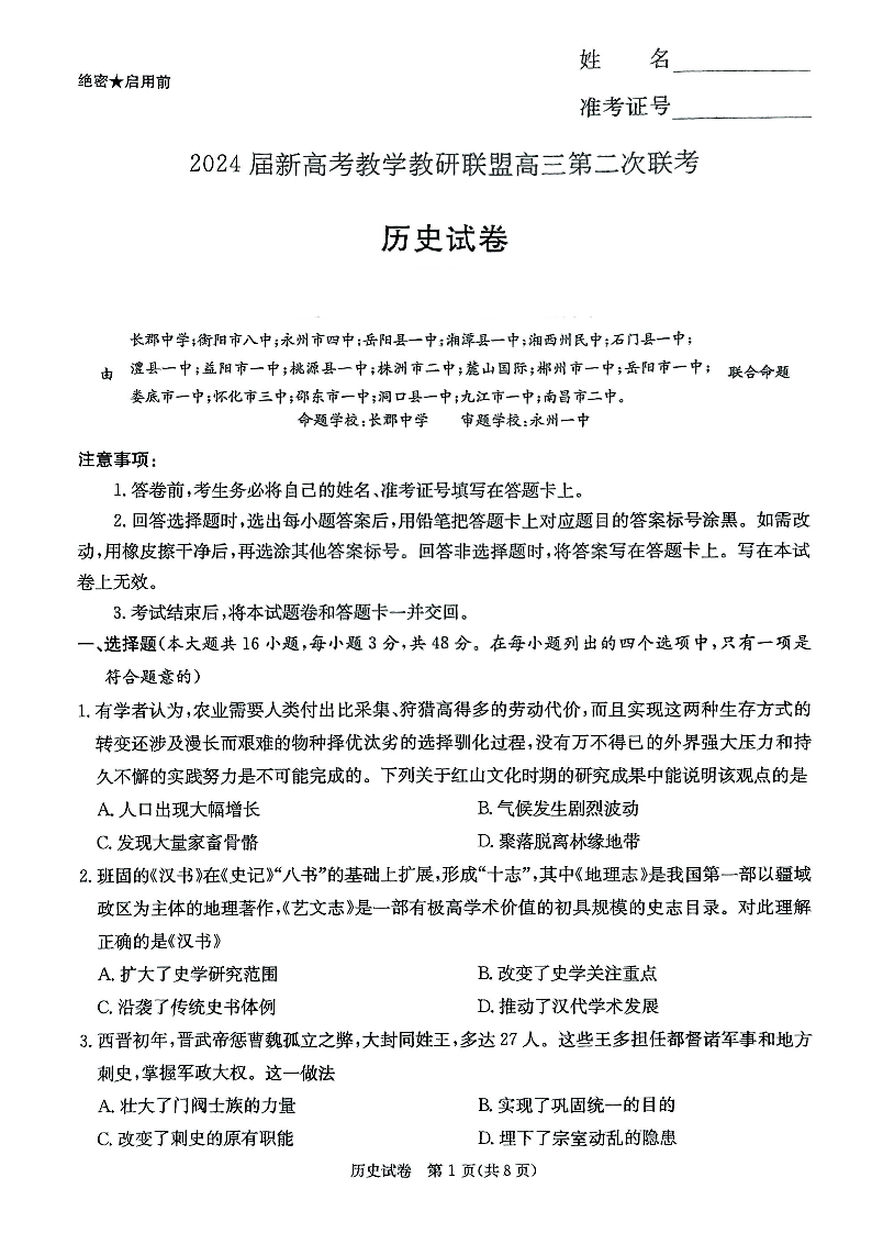 湖南新高考教学教研联盟2024届(暨长郡十八校)高三第二次联考历史
