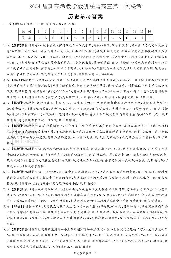 湖南新高考教学教研联盟2024届(暨长郡十八校)高三第二次联考历史答案