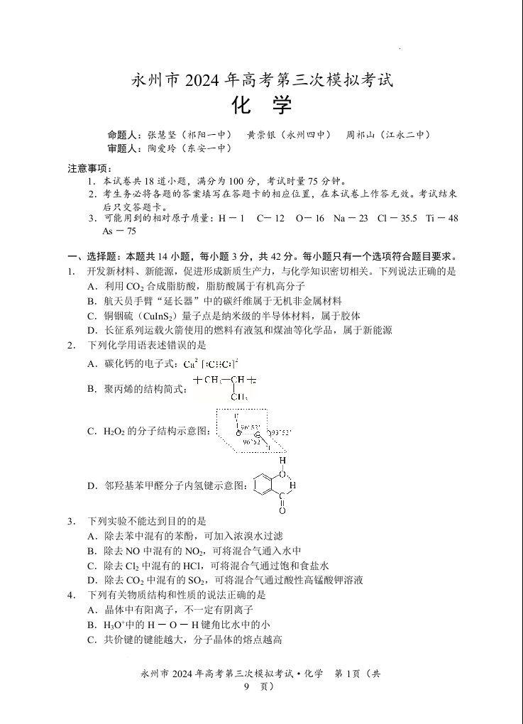 湖南省永州市2024年高三年级高考第三次模拟考试(永州三模)化学