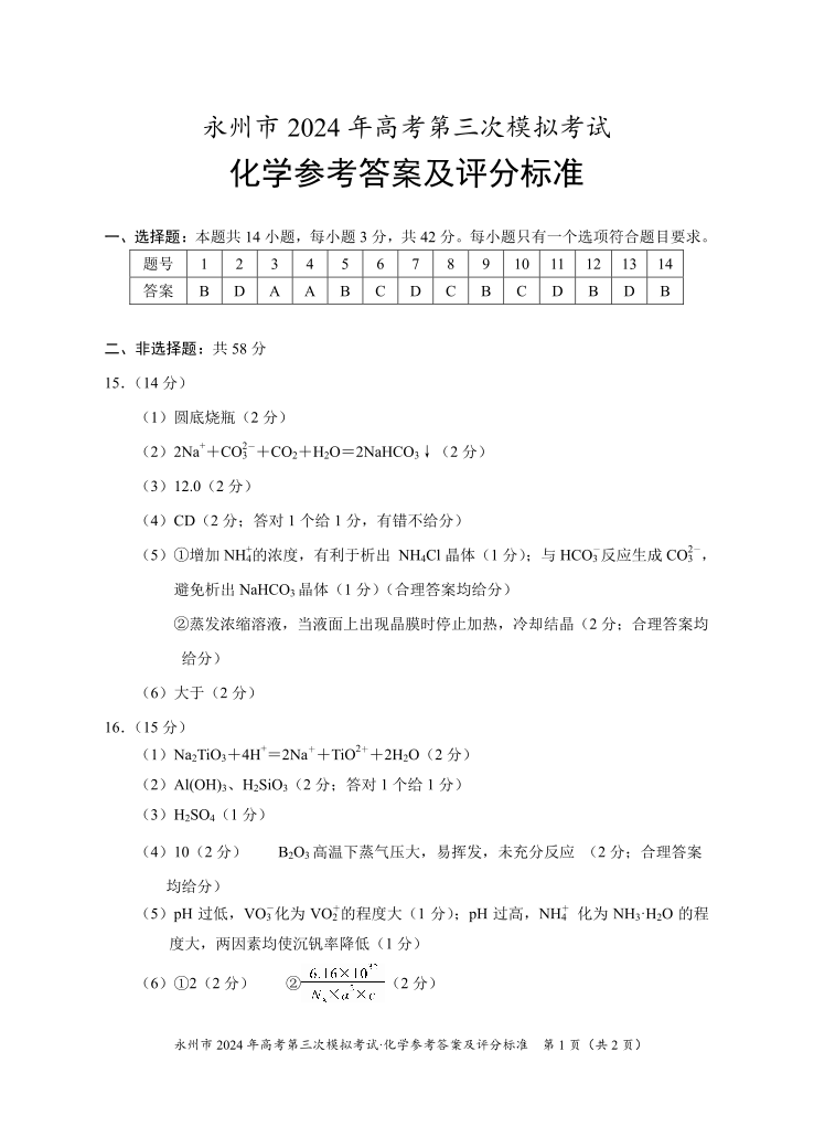 湖南省永州市2024年高三年级高考第三次模拟考试(永州三模)化学答案