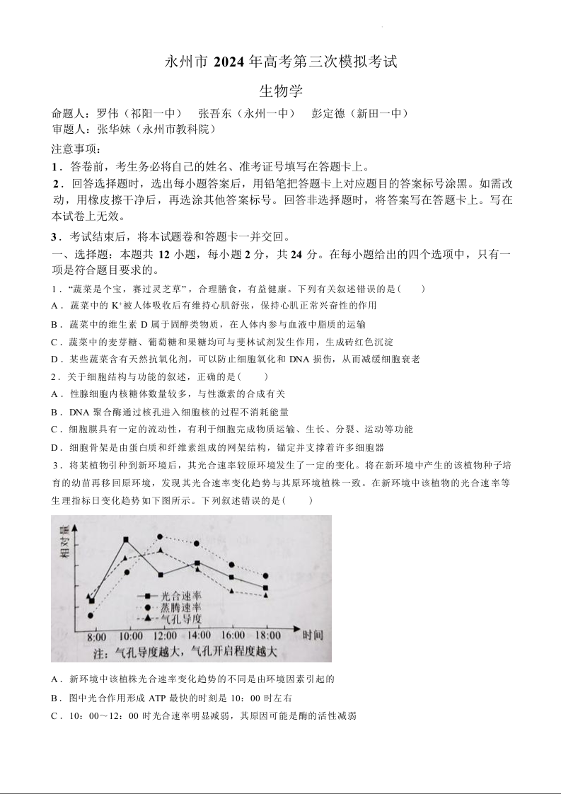 湖南省永州市2024年高三年级高考第三次模拟考试(永州三模)生物+答案