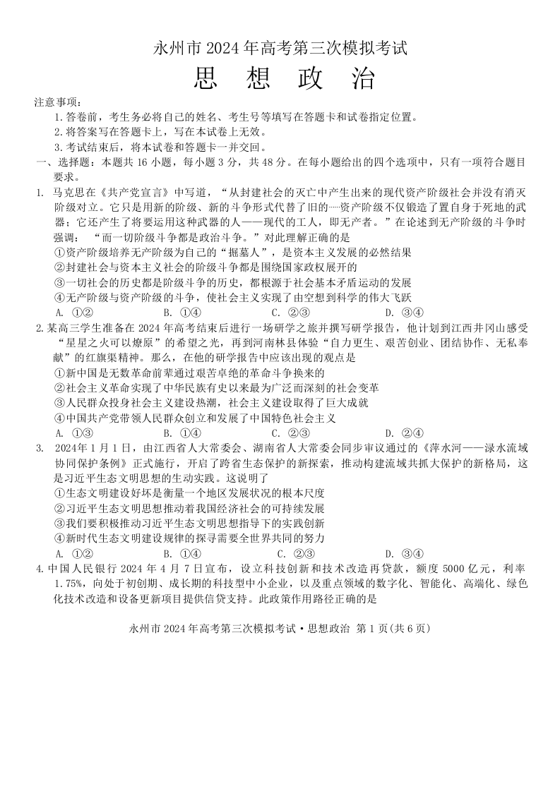 湖南省永州市2024年高三年级高考第三次模拟考试(永州三模)政治