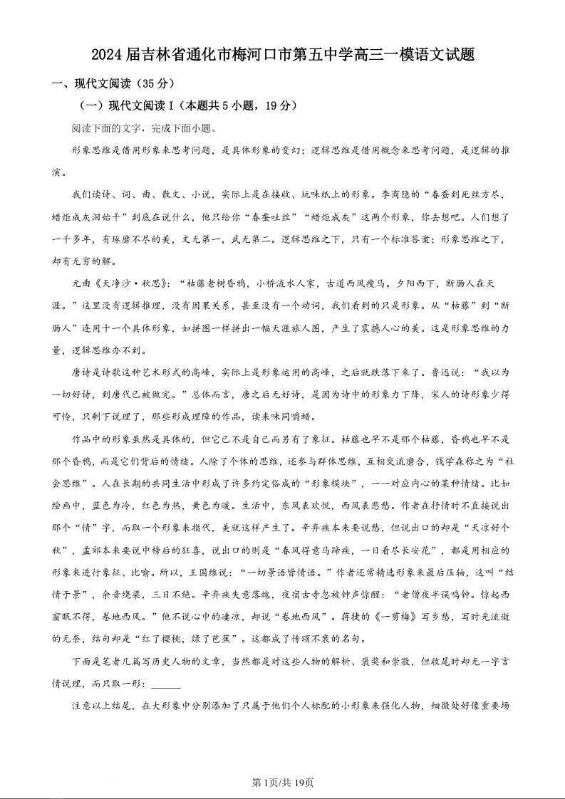 吉林省通化市梅河口市第五中学2024届高三下学期一模语文(精品解析版)