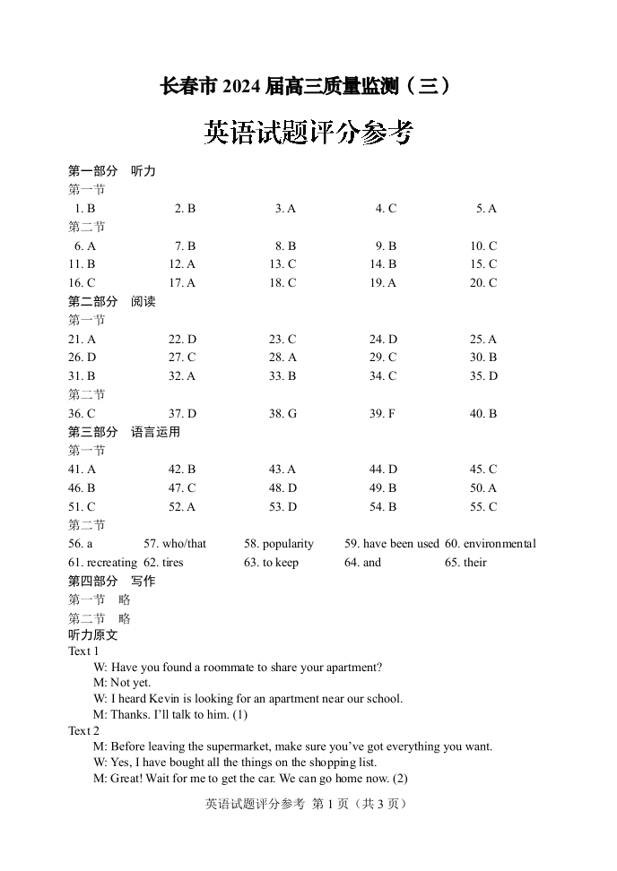 吉林省长春市2024届高三下学期第三次质量监测(长春三模)英语答案