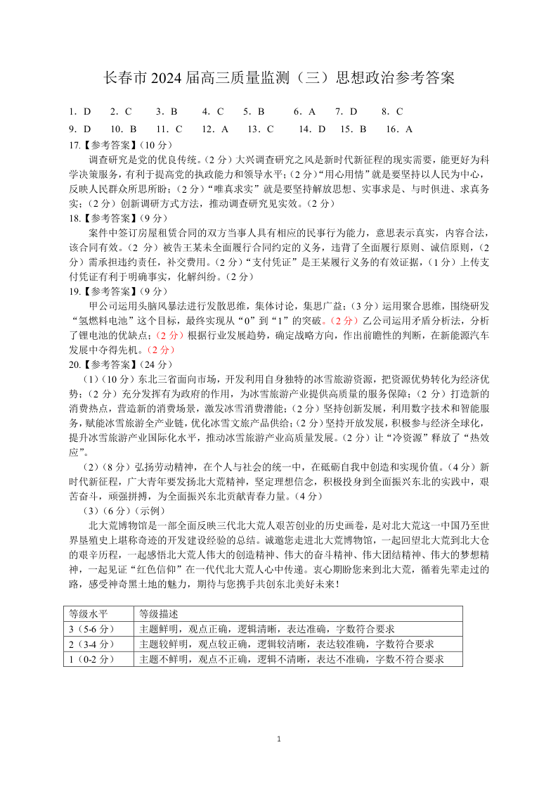 吉林省长春市2024届高三下学期第三次质量监测(长春三模)政治答案