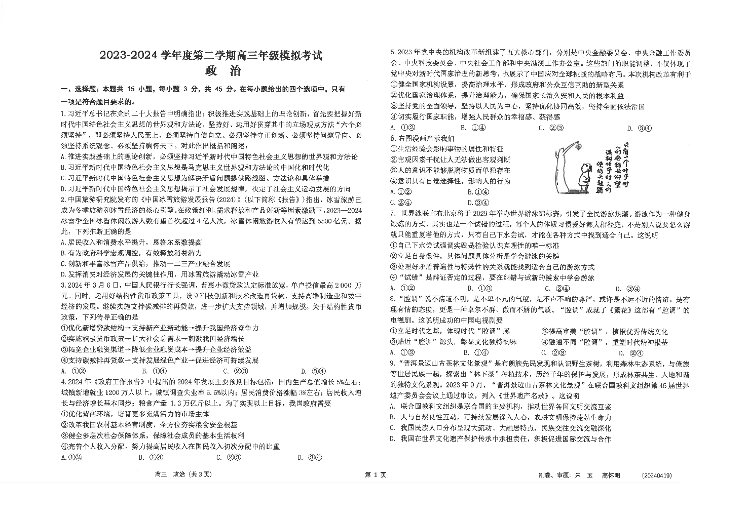 江苏省南通市2024届海安高级中学高三下学期第二次模拟考试政治+答案