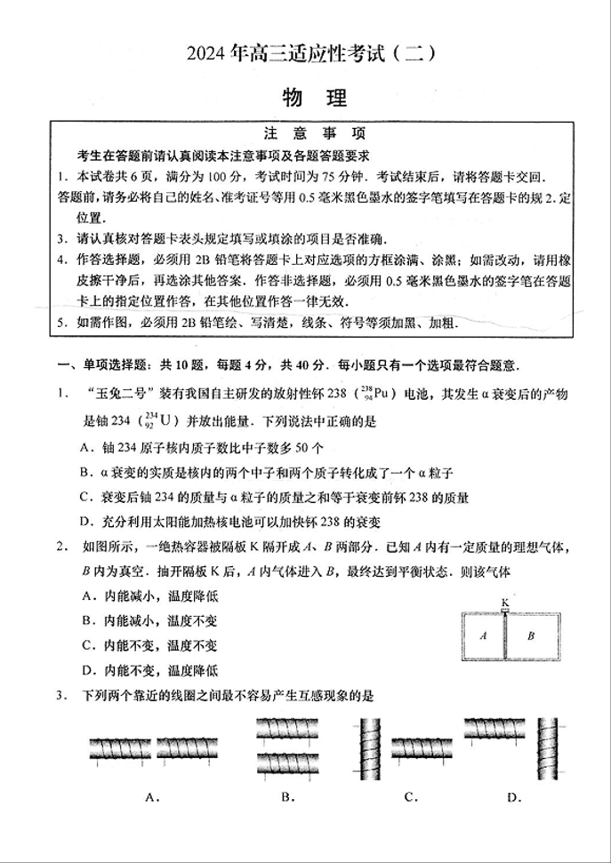 江苏省南通市如皋市2024届高三下学期适应性考试(二)(南通2.5模)物理+答案