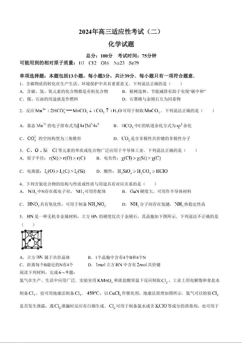 江苏省南通市如皋市2024届高三下学期适应性考试(二)(南通2.5模)化学+答案