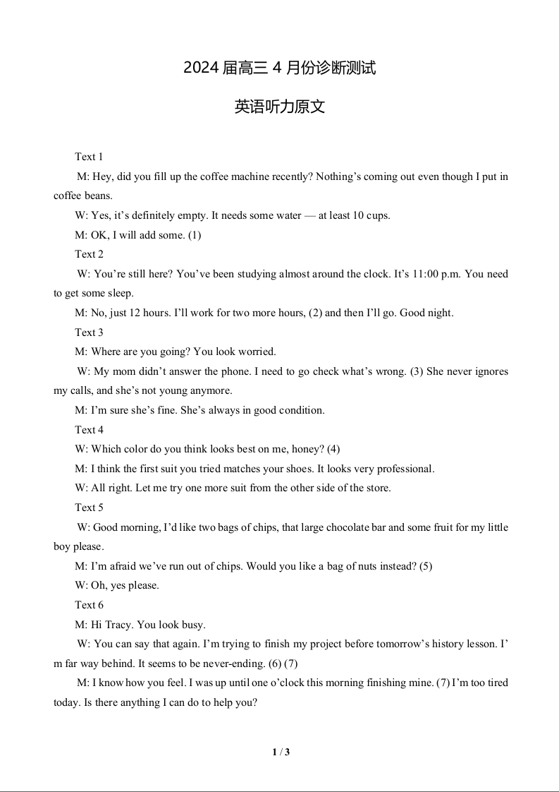 江苏新高考基地学校2024届高三下学期第五次大联考英语听力原文