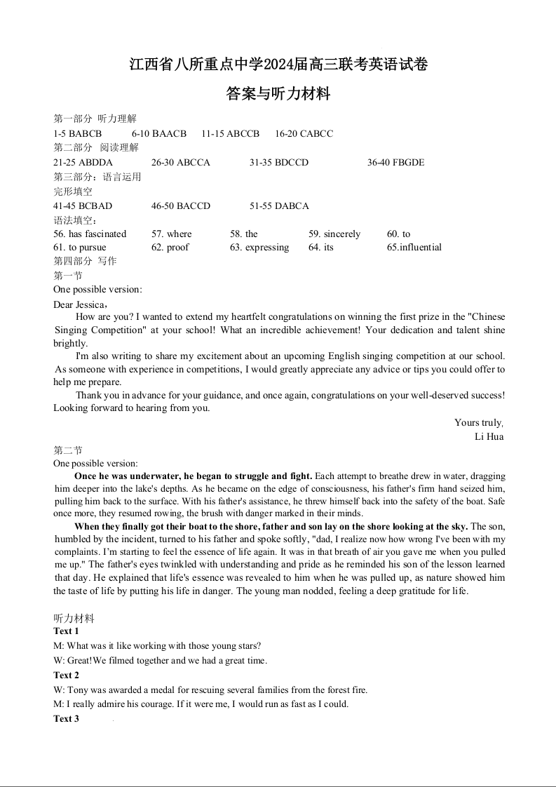 江西省八所重点中学2024届高三下学期4月联考英语答案