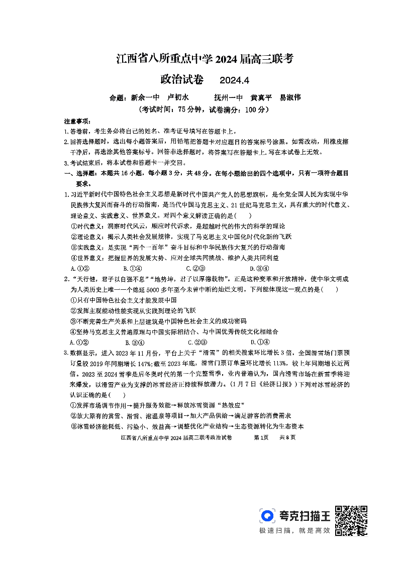 江西省八所重点中学2024届高三下学期4月联考政治