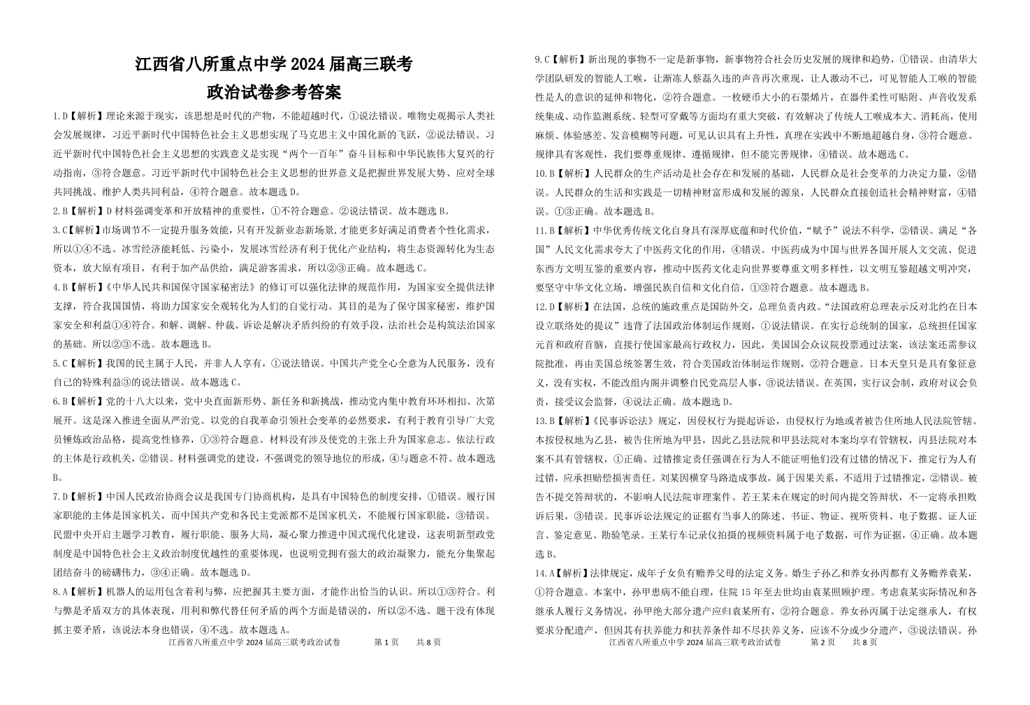 江西省八所重点中学2024届高三下学期4月联考政治答案
