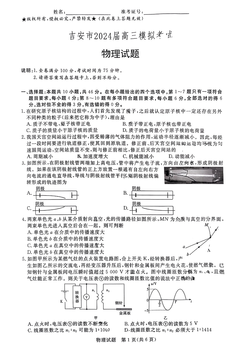 江西省恩博2024年高三4月联考(赣抚吉)物理