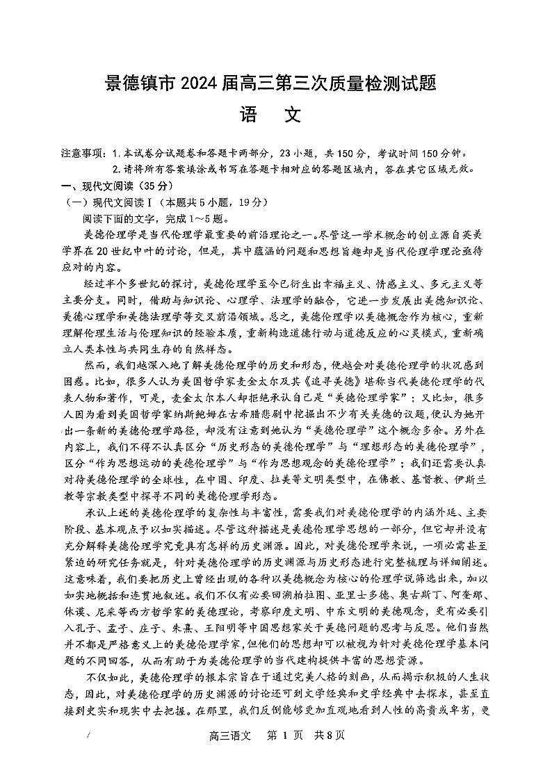江西省景德镇市2024届高三第三次质量检测(景德镇三模)语文