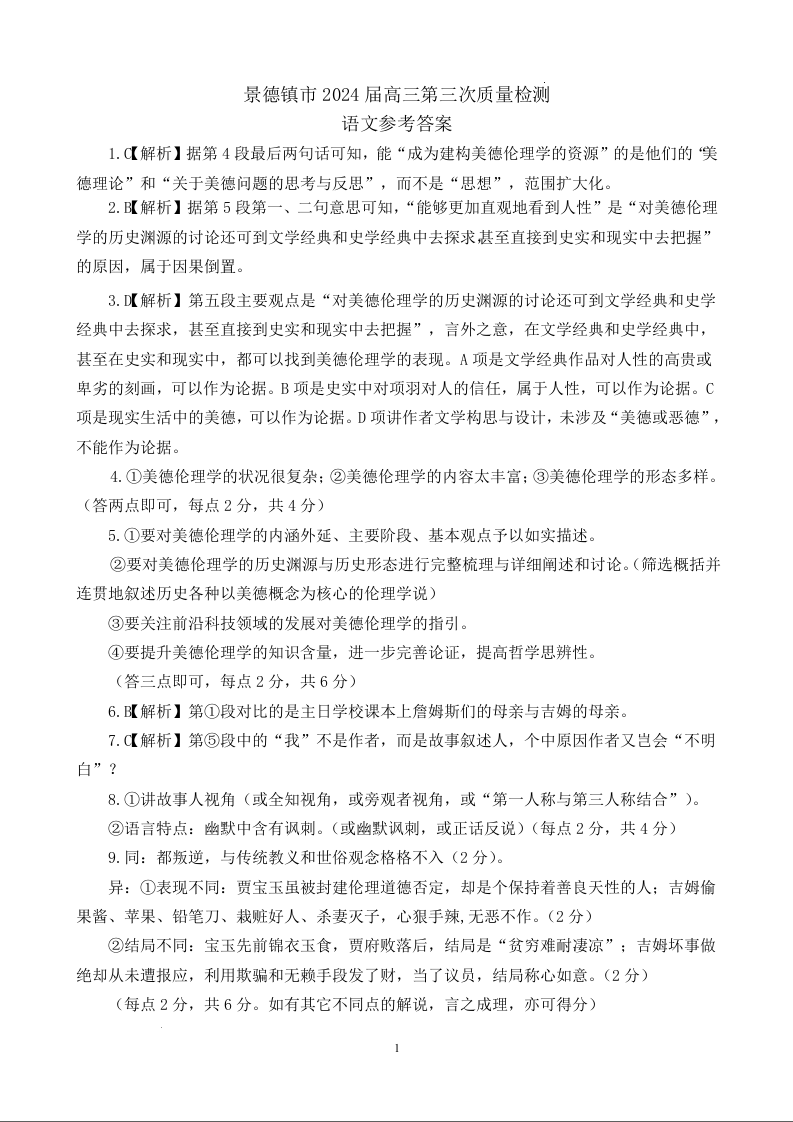 江西省景德镇市2024届高三第三次质量检测(景德镇三模)语文答案