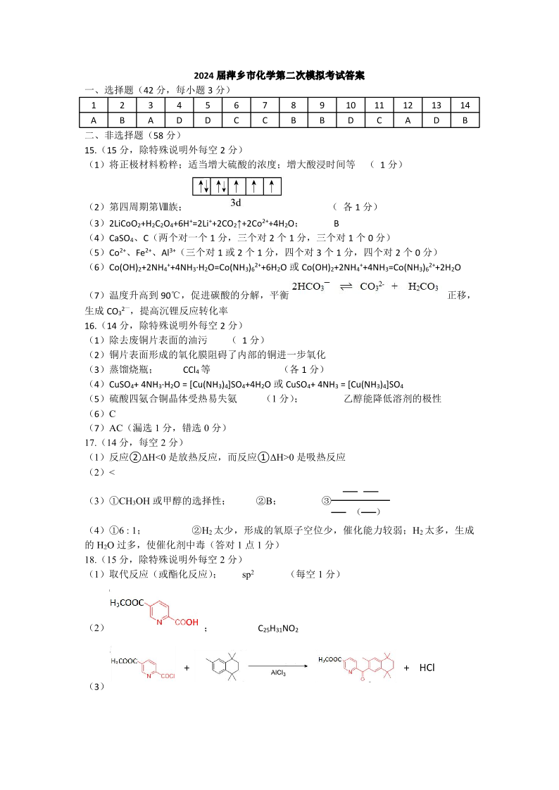 江西省萍乡市2024届高三下学期二模考试化学答案