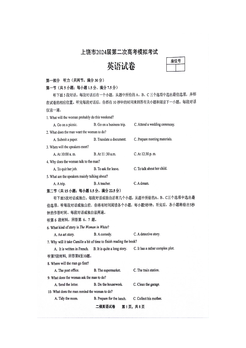 江西省上饶市2024届高三下学期第二次模拟考试(上饶二模)英语+答案