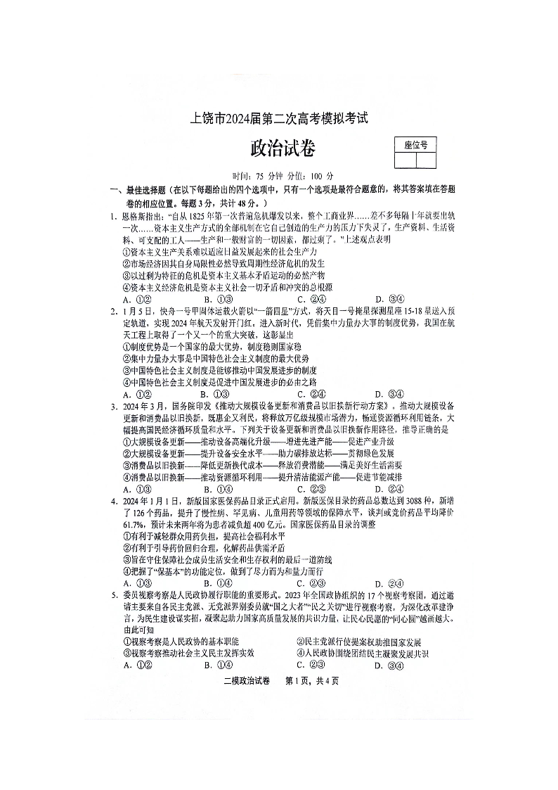 江西省上饶市2024届高三下学期第二次模拟考试(上饶二模)政治+答案