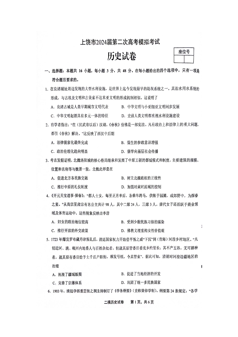 江西省上饶市2024届高三下学期第二次模拟考试(上饶二模)历史+答案