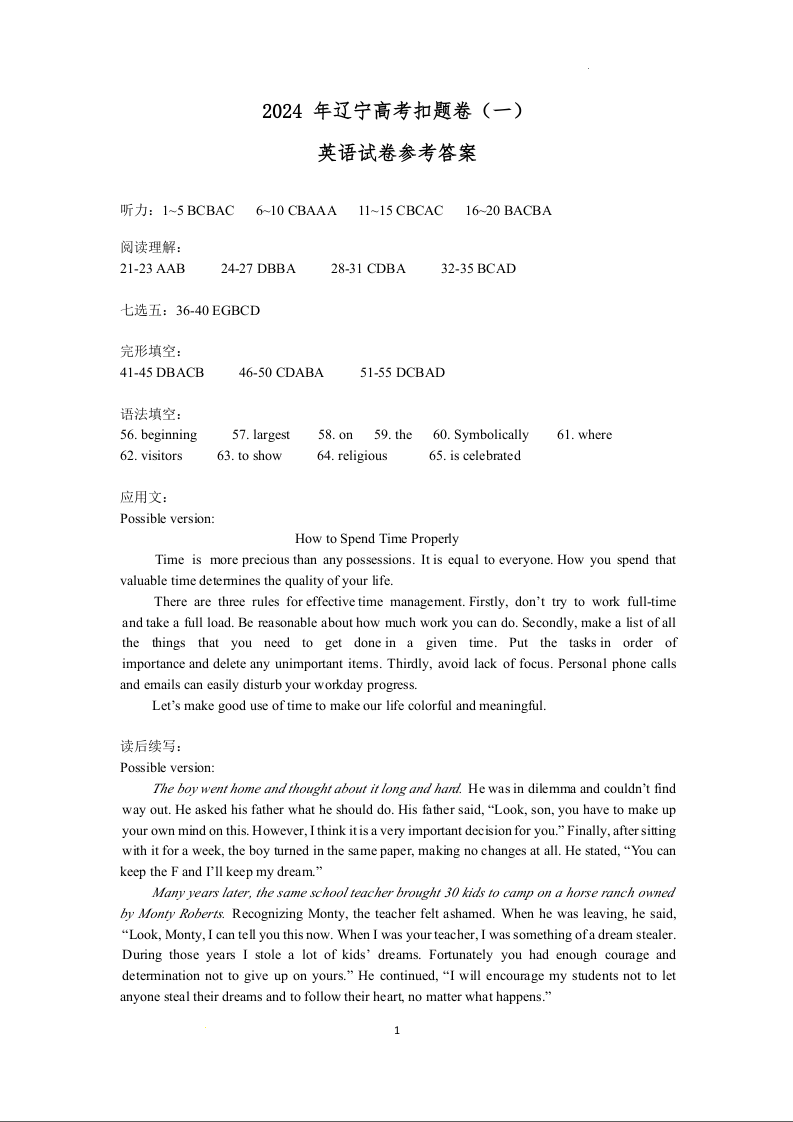 辽宁省2024届高三下学期高考扣题(一)英语答案